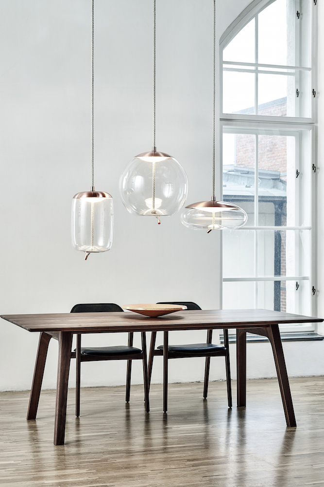 The KNOT collection is equipped with glass globes in different shapes and sizes with a cord running through the heart of the fixture. The light source is situated in the top and provides friendly light.