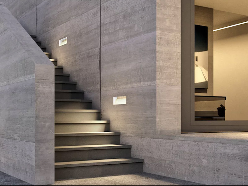 - The housing that remains embedded inside the casting and houses the lighting element. The housing is supplied with bolts, locking system and stickers to be applied on the outside of the retaining panels so to secure a perfect alignment for multiple installations of each housing when pouring the concrete. The lighting element in die cast aluminium is anchored to the casing through proper screws and it remains completely hid into the void.