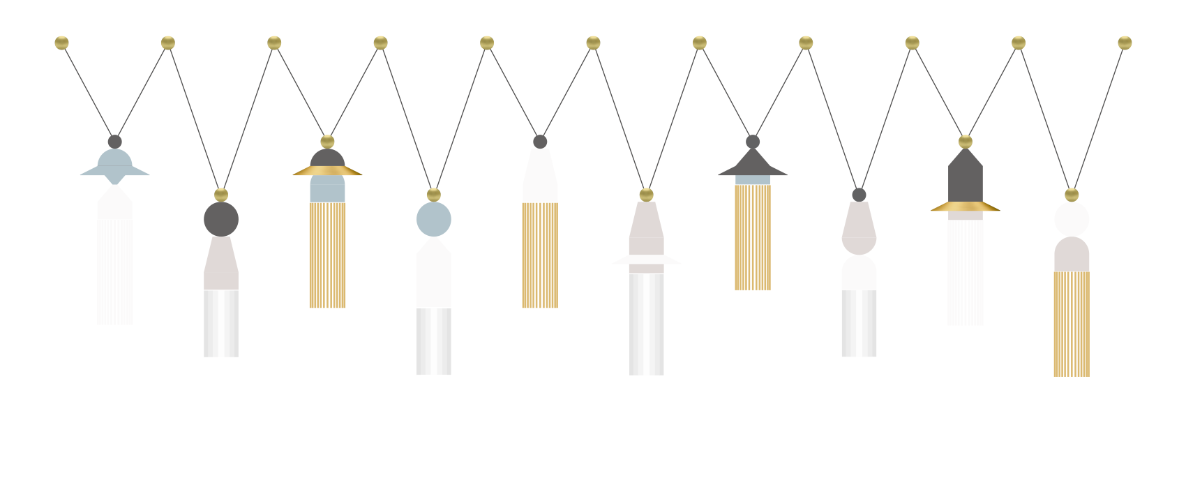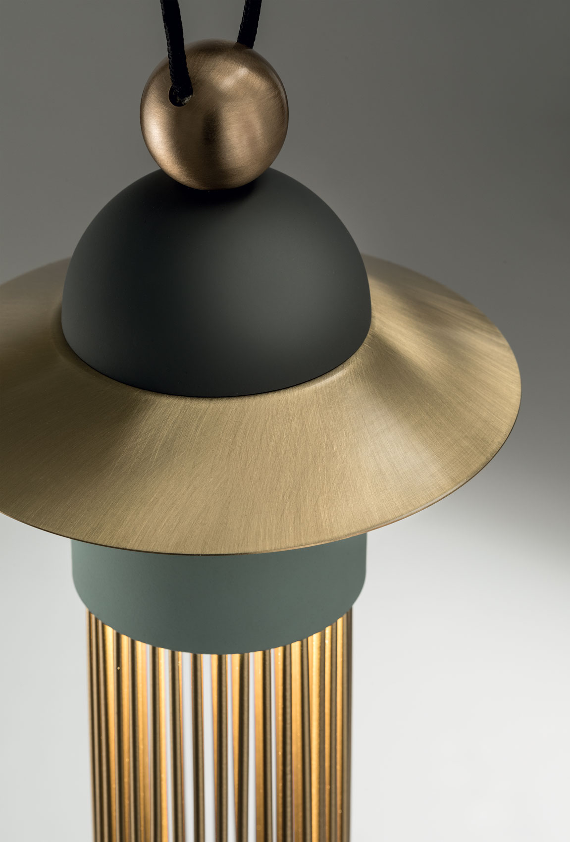 The metal bodies are enriched with brushed brass details, and the traditional textile fringes are replaced with small varnished or gold metallic beams. The characteristic technical element that has been elaborated to be a distinctive aesthetic mark is the ceiling fixing system: brass spheres connect the power wire and fix the elements to the ceiling, drawing a lines plot between elements. The tassels give a contemporary and minimalist design, intensified by the touch-effect matt pastel finishings. A total white finishing is available too. Warm-light LED system produces 750 lm, and the light is amplified from metallic fringes or a smoke glass striped borosilicate diffusor.