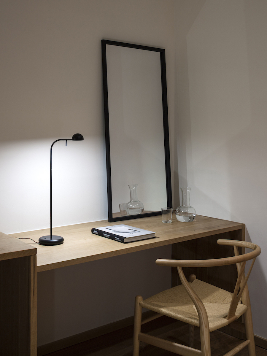 The table lamp is available with a short arm (1650) and a long arm (1655). The LED light source is perfectly integrated into the adjustable hood.