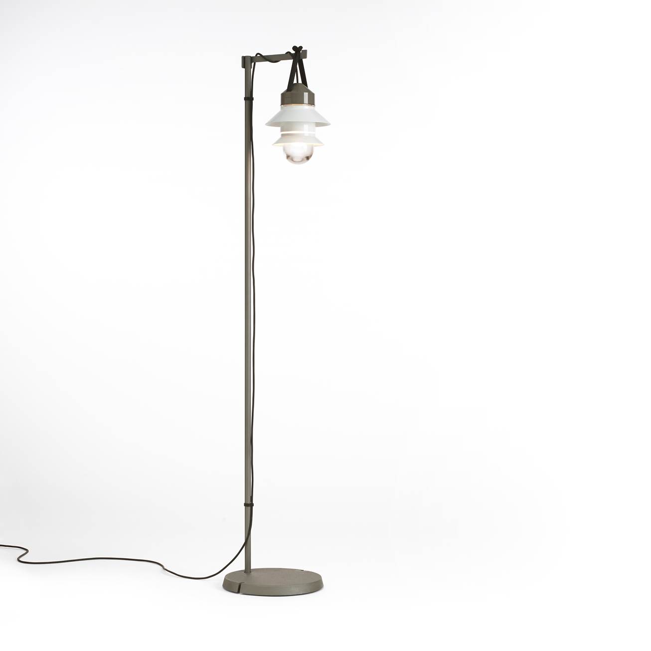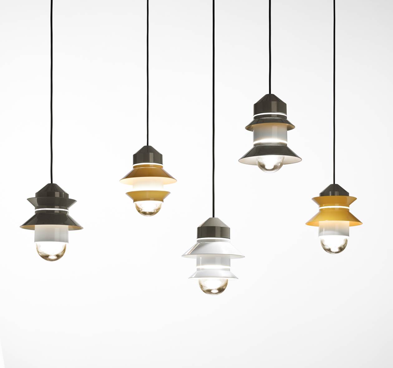 MARSET expanded their outdoor collection with SANTORINI. The inspiration for this lamps comes from lanterns on old fishing boats. SANTORINI has a warm atmosphere . The user can define the number of shades which gives the opportunity to give an own touch to it. SANTORINI gives direct and reflected light. The different types and colors makes this lamps ultra-adaptable. The SANTORINI collection is designed by studio SPUTNIK. A Spanish design studio composed by Majo Fernández, María de la O Reyna, María Salar and Borja Sepulcre. SANTORINI can be used as a garland, wall lamp, floor lamp or pendant light. The lamps are made from gray polycarbonate and the diffusers are from blown glass. For the garland style, wall lamp and floorlamp are black rubber straps available. The shades are available in white, gray and musterd.