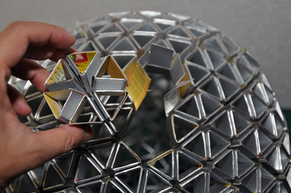 The design is achieved by unfolding the packets and refolding them into hexagonal and pentagonal sections that are then pieced together to form a geodesic sphere or any other desired shape. Here, the Epcot-like ball makes an attractive overhead light and casts an impressive web of shadows and shapes on the surrounding space.